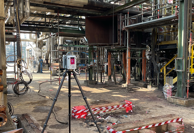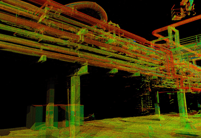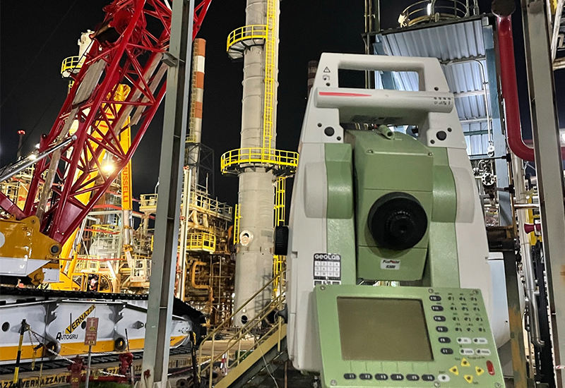 Rilievo, tracciamenti, verticalità colonne in impianto Oil and Gas. Rilievo eseguito con Stazione Totale robotizzata Leica TCRA 1201, precisione 1″ angolare, Livello digitale Dini 12 e Gps Leica GS07.
